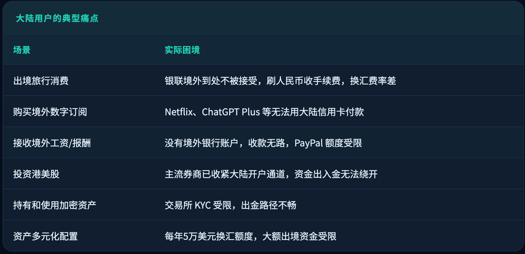 大陆用户面临的金融困境不是个例,而是系统性问题。你存在支付宝和微信里的钱是人民币,是大陆银行体系内部流通的电子凭证。一旦你需要出境消费、投资海外市场、接收境外收入、或者做任何与”人民币以外”有关的事,就会撞上一堵墙。