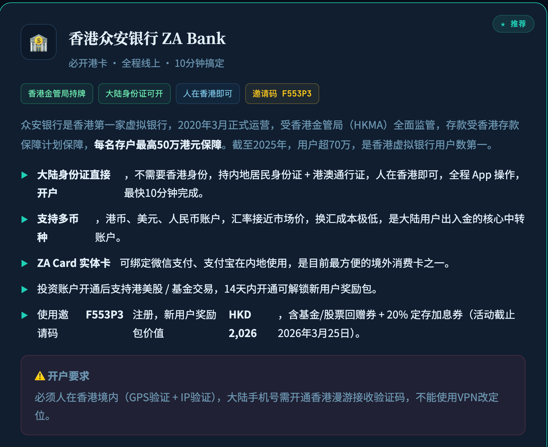整个体系的地基。ZA Bank 线上10分钟完成,但需要人在香港。建议下次去香港旅游时第一个搞定。开户时记得使用邀请码 F553P3 激活奖励包。