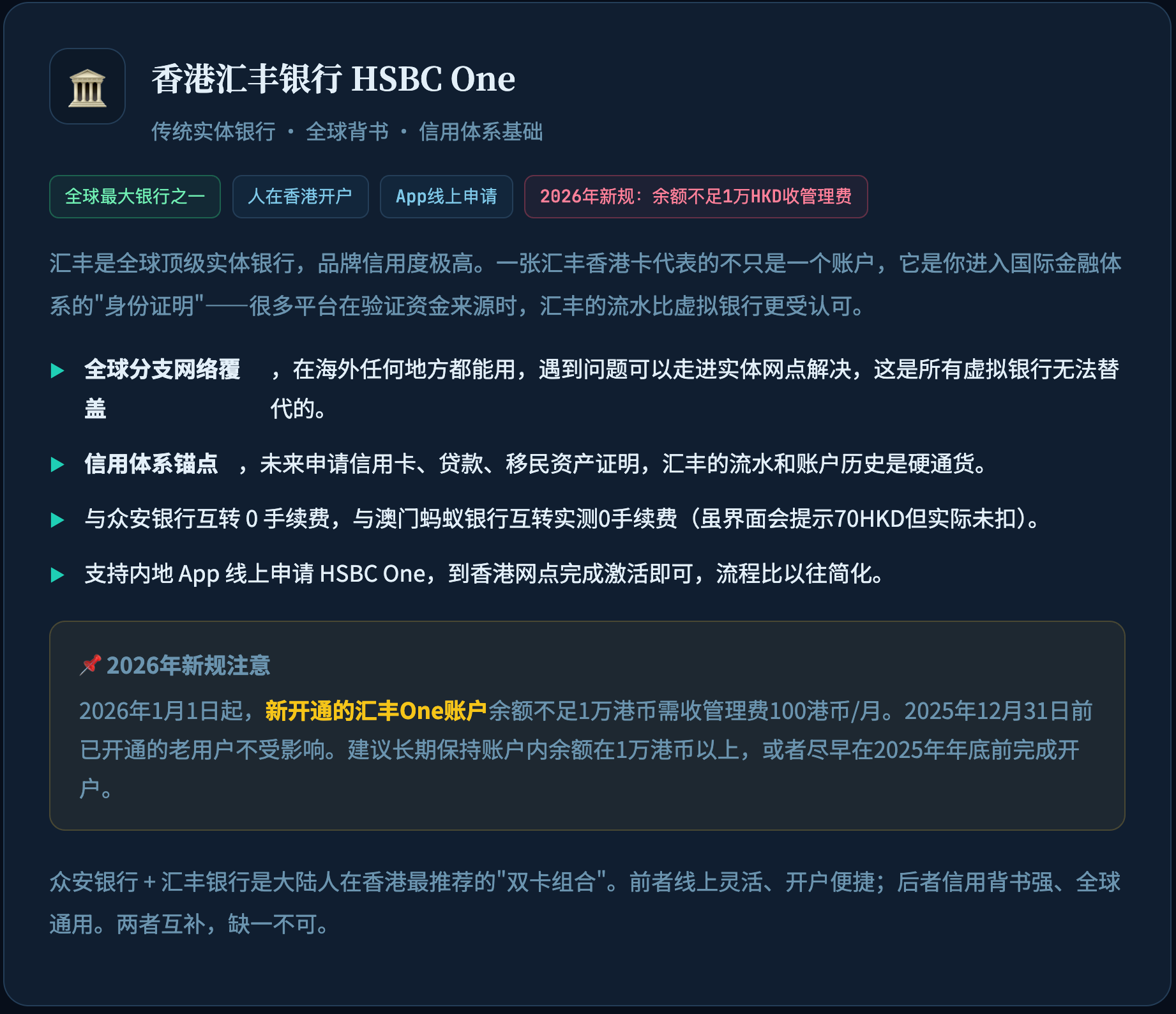 在香港支行或通过 App 线上申请,去网点激活。汇丰是信用体系的锚点,长期资产证明不可或缺,2025年底前开户可避开新管理费政策。